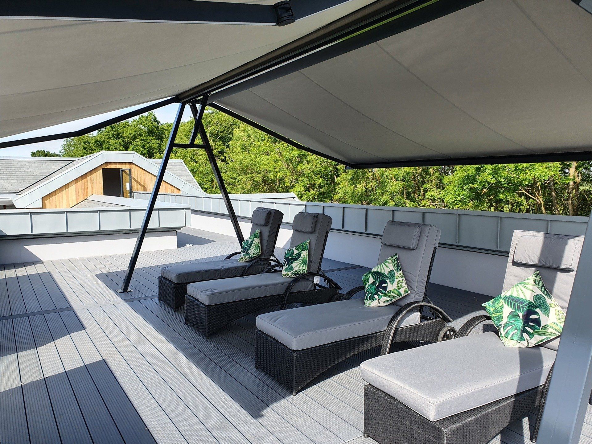 Create a tranquil spot for you to relax in with our bioclimatic pergola. The steel frame and custom shutters create the perfect environment where you can sit, eat and enjoy the shade from your property. In addition, it offers a watertight seal, sheltering from the rain as well as 100% UV protection when they are closed. Once partially open it will allow part shade and a cooling breeze so that you can spend more time outdoors during the summer months. Installed on our modular steel frame system, you can enjoy a crisp finish with hidden fixings and cables.